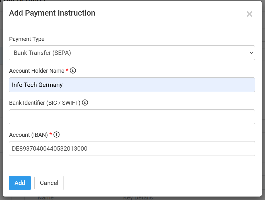 2. Under Payment Instructions, add your payment details (e.g., Bank Transfer (SEPA), Bank Transfer, BPAY etc).