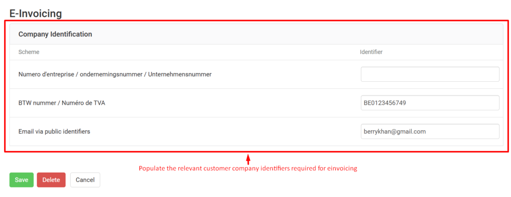 • Applicable E-Invoicing Company Identifiers (e.g., VAT, registration, or tax IDs).
