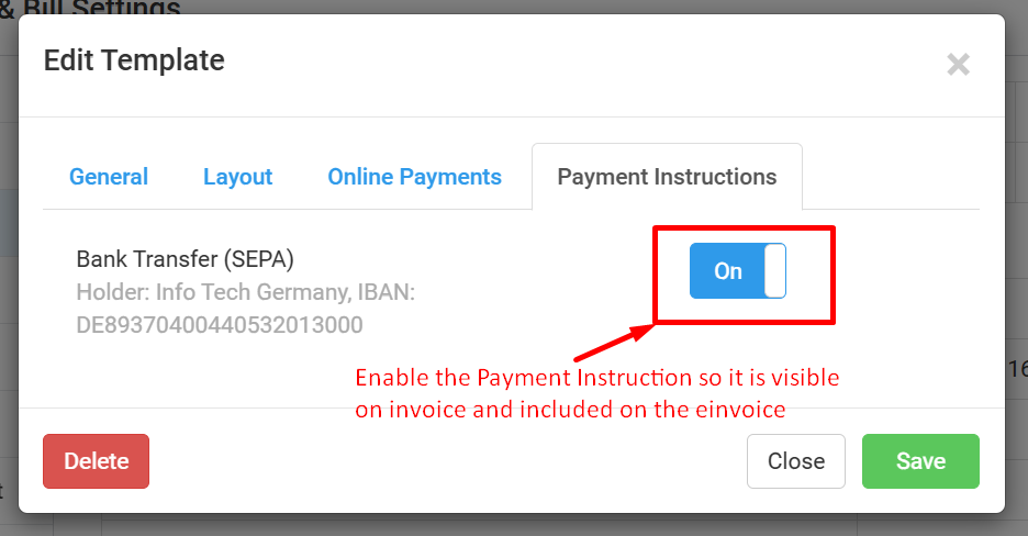 3. Enable these payment instructions for the invoice template you’ll use for e-Invoicing.