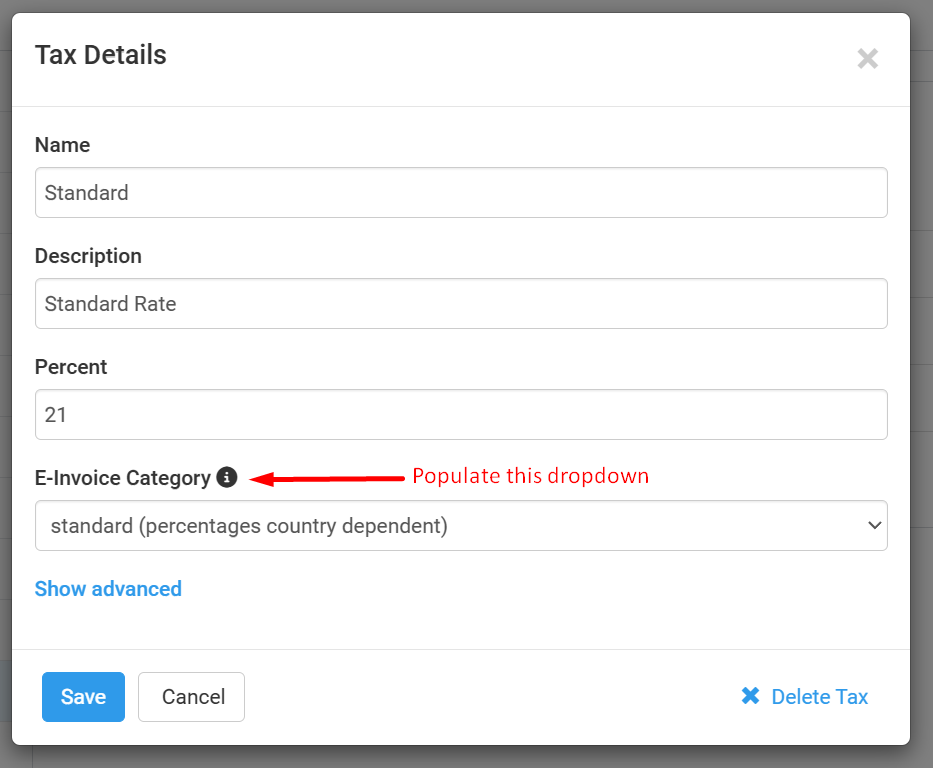 Each tax code in Avaza must be mapped to the correct E-Invoice Category.