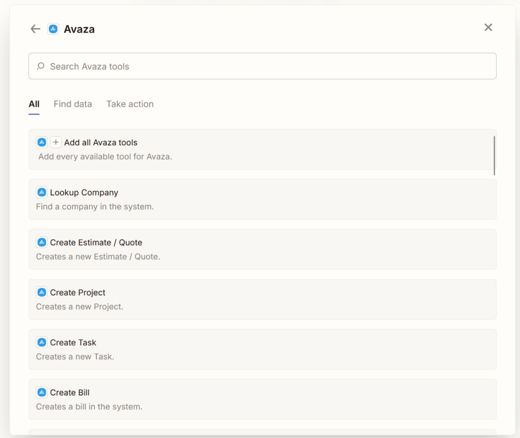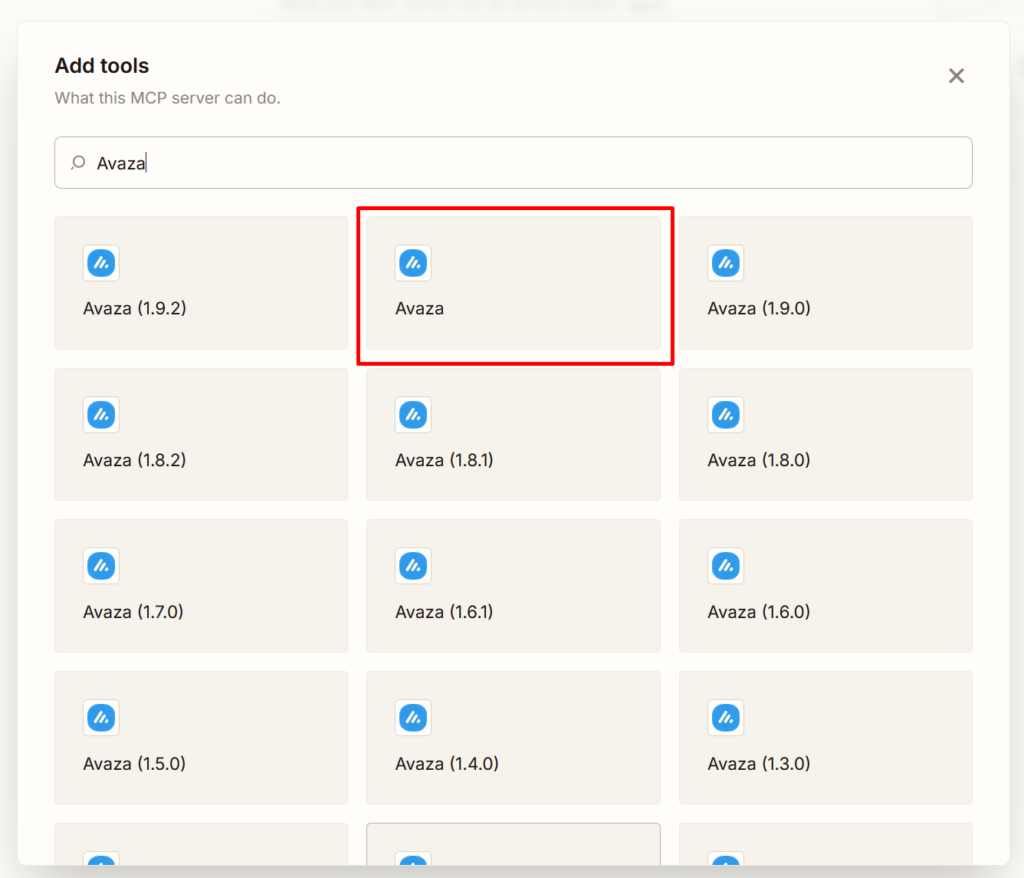 - Select Add all Avaza tools to make all actions available to your AI client.