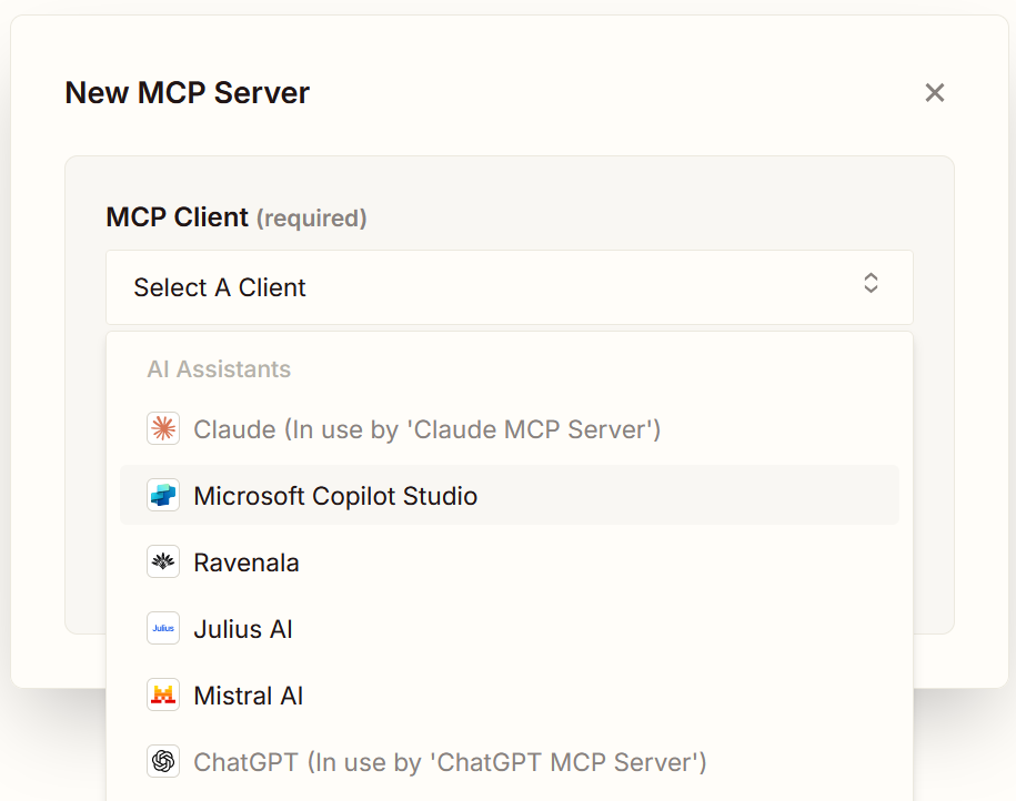 - In the MCP Client dropdown menu, select your client. (Claude, ChatGPT, CoPilot etc)
