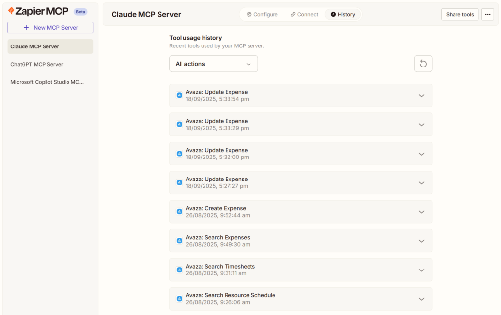 - That’s it! Your Zapier MCP server is now connected to Avaza and ready to use with your AI client.