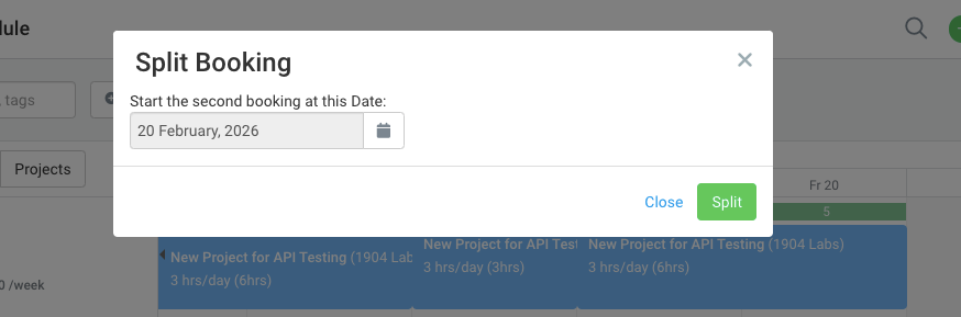 The Split Booking feature allows you to divide an existing multi-day resource booking into two separate schedule series. This is useful when plans change mid-booking and you need to adjust dates, availability, or scheduling rules for the remaining time period without editing the entire original booking.