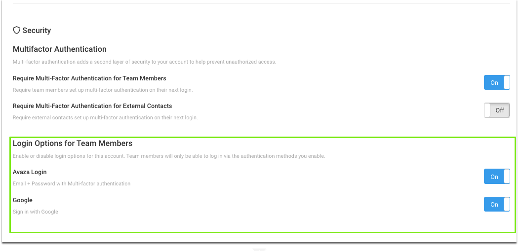 - You cannot disable Avaza Login unless at least one SSO option is enabled